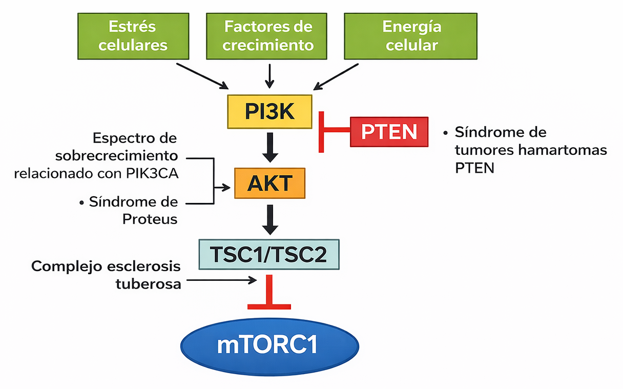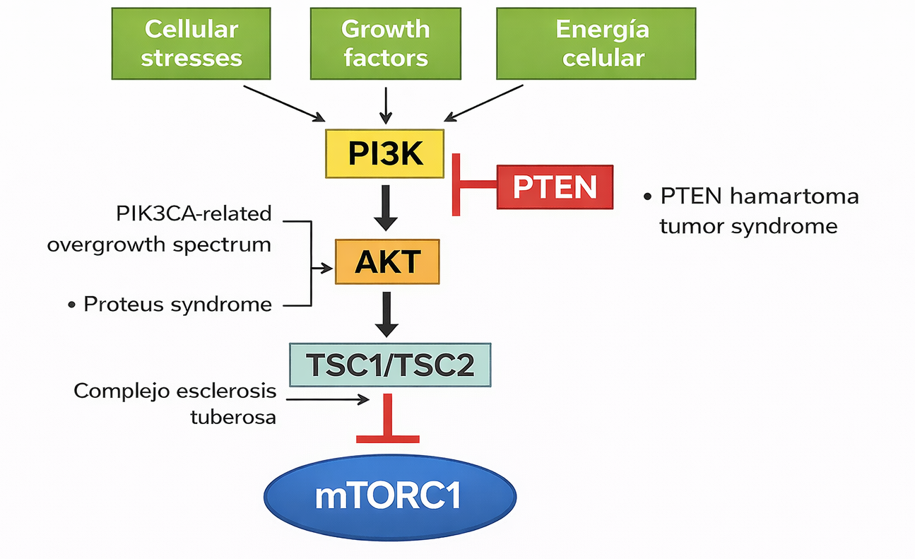 Proteus syndrome is related to a dysregulation of the PI3K-AKT pathway. On one hand, the PI3K protein is phosphorylated, activating transcriptional activation of the vascular endothelial growth factor (VEGF) and the expression of the hypoxia-inducible factor 1α (HIF1α) angiogenesis, growth, senescence, and other processes, through molecular mechanisms (See Figure 1 and 2) (Pinzón C, Serrano M, Sanabria M, 2009).