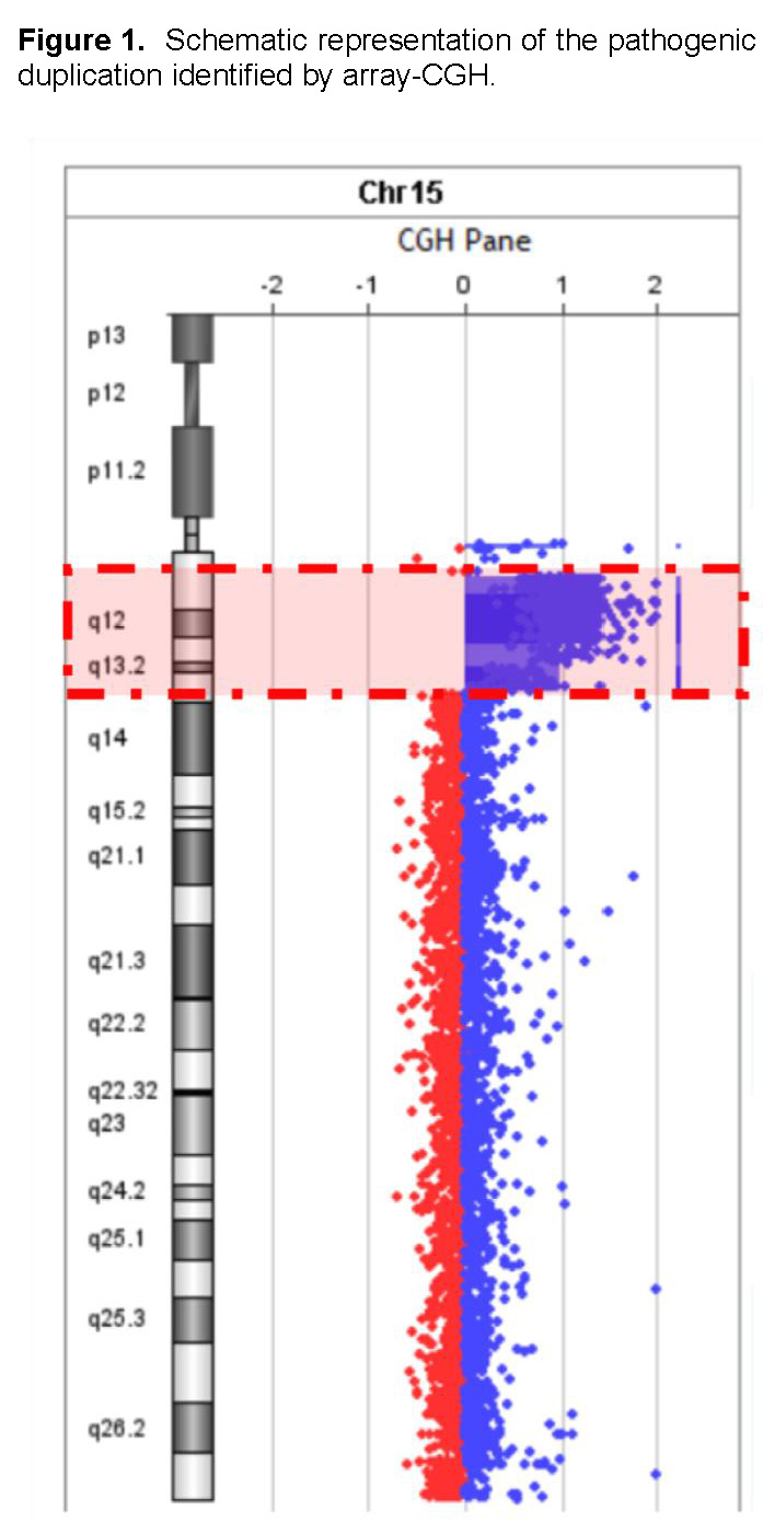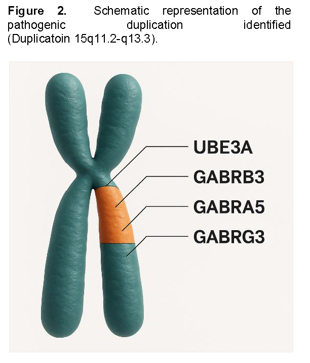 Application of this technique enabled identification of a pathogenic submicroscopic duplication in the 15q11.2–q13.3 region, thereby establishing the etiologic diagnosis and facilitating a more targeted clinical approach. Array-CGH proved to be a high-resolution method with significant diagnostic value in patients with complex neurological phenotypes, as it allows precise detection of copy number variations that are undetectable by conventional methods.