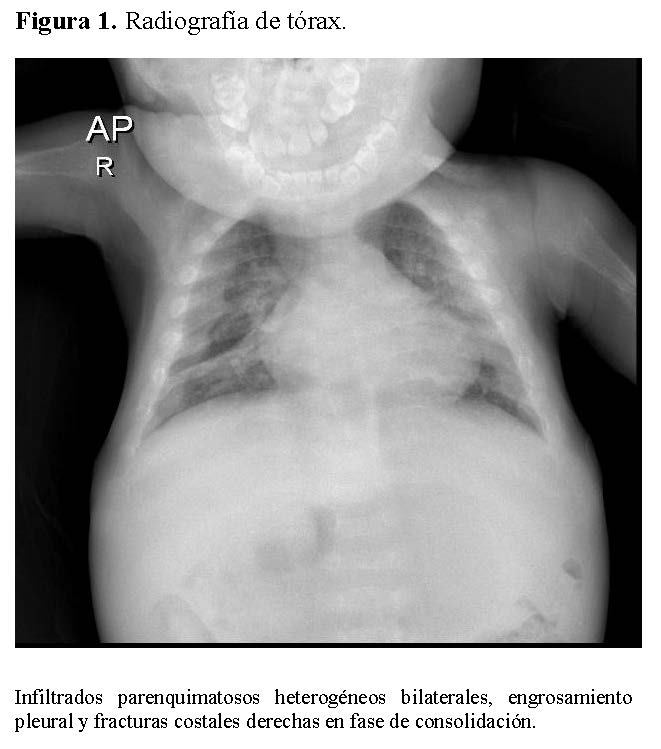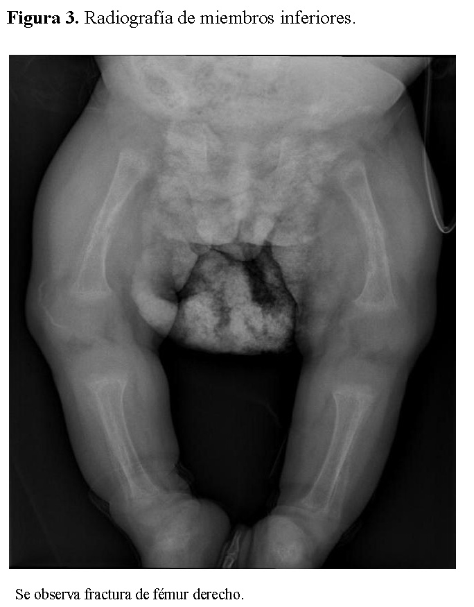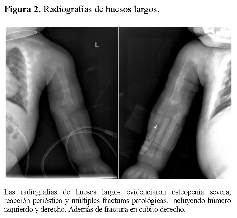La radiografía de tórax mostró infiltrados parenquimatosos heterogéneos bilaterales, engrosamiento pleural y fracturas costales derechas en fase de consolidación (Figura 1). Las radiografías de huesos largos evidenciaron osteopenia severa, reacción perióstica y múltiples fracturas patológicas, incluyendo húmero derecho e izquierdo, cúbito derecho y fémur derecho (Figuras 2 y 3).