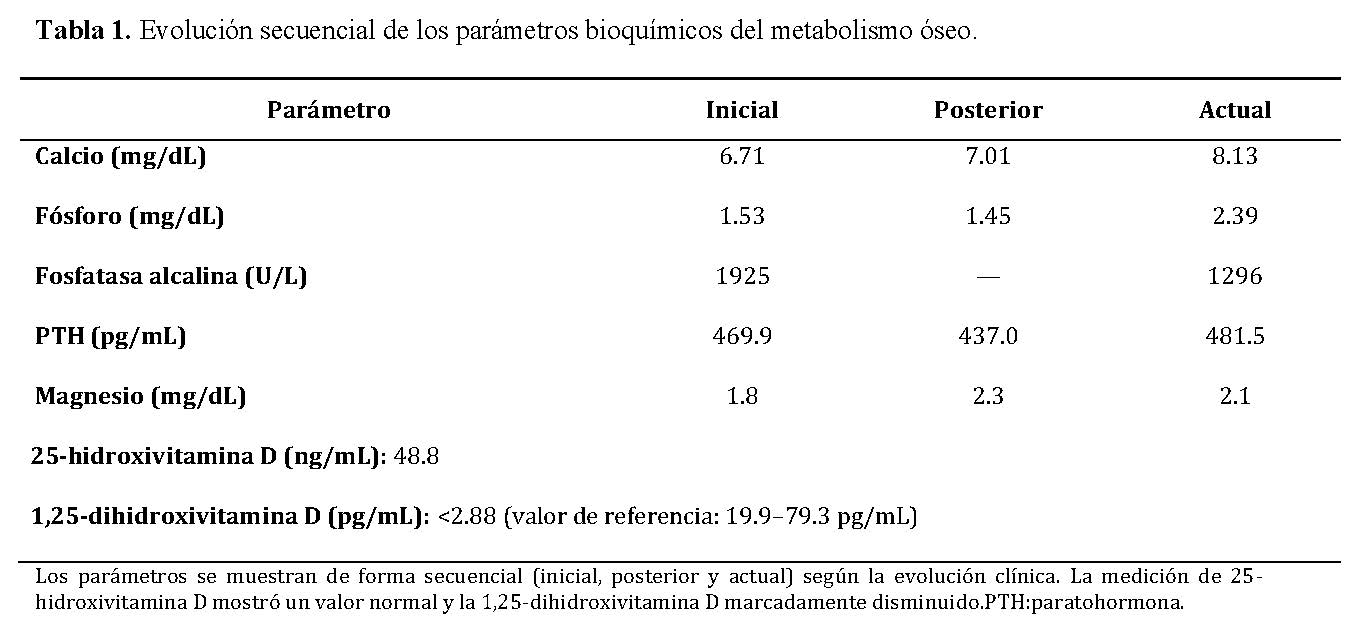Los estudios bioquímicos revelaron alteraciones severas del metabolismo mineral, con hipocalcemia persistente, hiperparatiroidismo secundario, elevación marcada de fosfatasa alcalina., niveles normales de 25-hidroxivitamina D y una marcada disminución de la 1,25-dihidroxivitamina D.